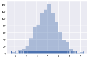 sns.distplot(x1, bins=20, kde=False, rug=True)