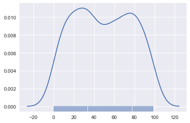 sns.distplot(x2, hist=False, rug=True)
