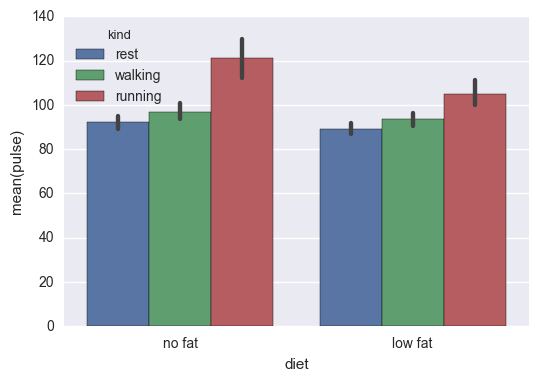 sns.barplot(x="diet", y="pulse", data=exercise, hue='kind')